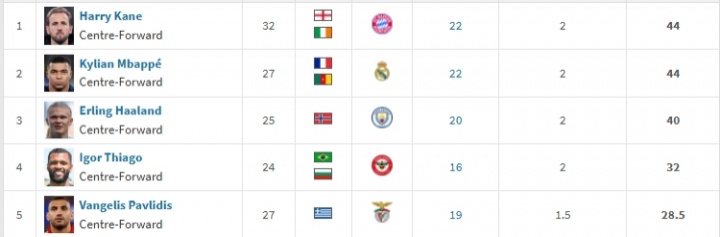 01月22日讯 德转最新欧洲金靴排名,凯恩与姆巴佩同积44分并列第1,哈兰德40分第3。